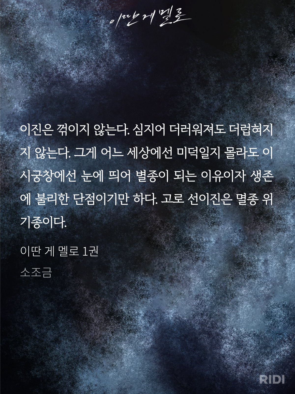 이딴 게 멜로 작품소개: ※ 본 도서는 90년대 후반을 배경으로 하고 있으며 단체, 지명은 실제와 무관한 픽션입니다.※ 본 도서는 강압적 행위와 폭력적인 묘사 등의 비도덕적인 요소가 포함되어